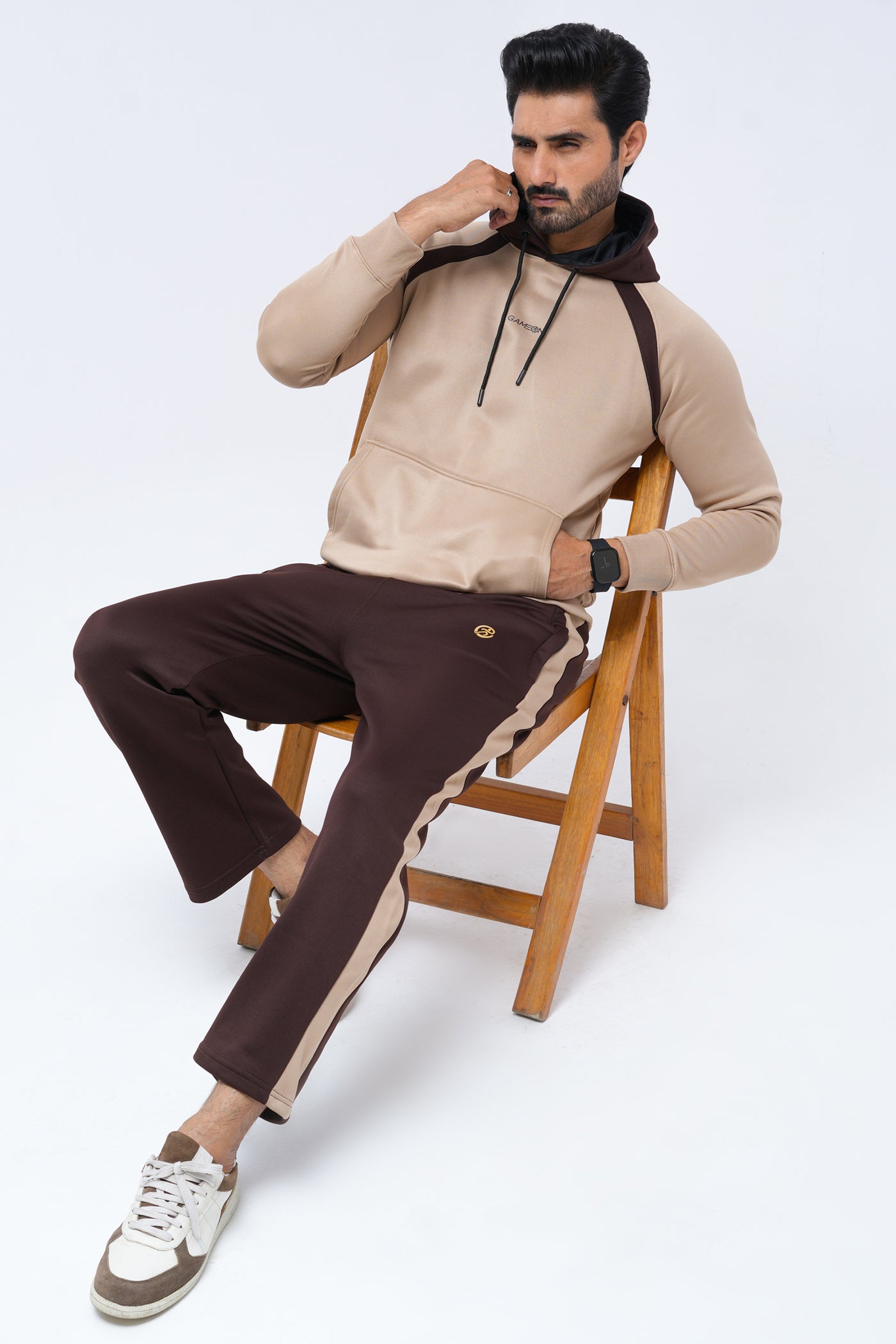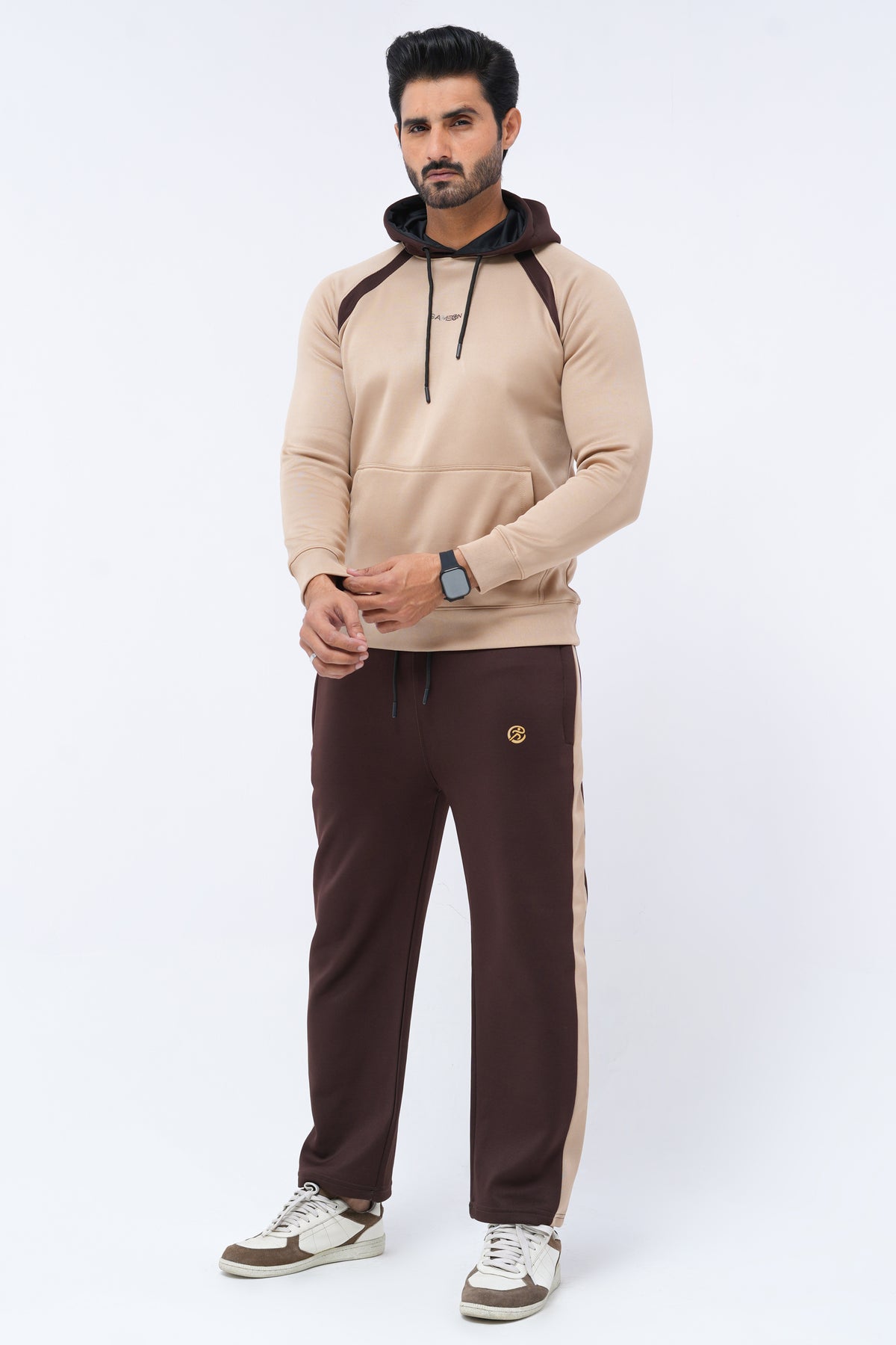 Stay effortlessly stylish and comfortable with our Classic Two-Tone Tracksuit. Crafted from premium soft fabric, this athletic set features a camel beige hoodie with contrasting chocolate brown panels and matching joggers with side stripes. Designed for everyday wear, workouts, or casual outings, it offers a perfect balance of performance and comfort. The modern fit, ribbed cuffs, and kangaroo pocket add a sporty edge, while the sleek color contrast keeps your look refined and trendy.